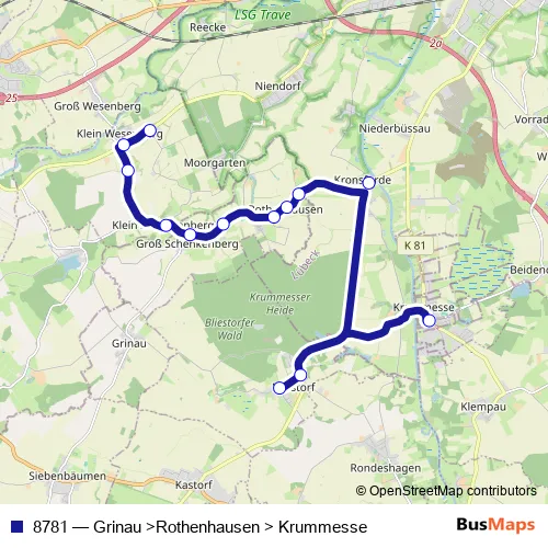 The first stop of the 8781 bus route is Krummesse, Schule and the last stop is Klein Wesenberg, Heideweg. 8781 (Grinau >Rothenhausen > Krummesse) is operational during on weekdays.