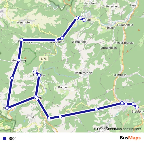 The first stop of the 882 bus route is Schuld Kriegerdenkmal and the last stop is Adenau Im Broel. 882 is operational during everyday.
