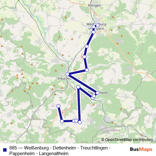 The first stop of the 885 bus route is Rehlingen Ortsmitte and the last stop is Weißenburg Plerrer. 885 (Weißenburg - Dettenheim - Treuchtlingen - Pappenheim - Langenaltheim) is operational during everyday.