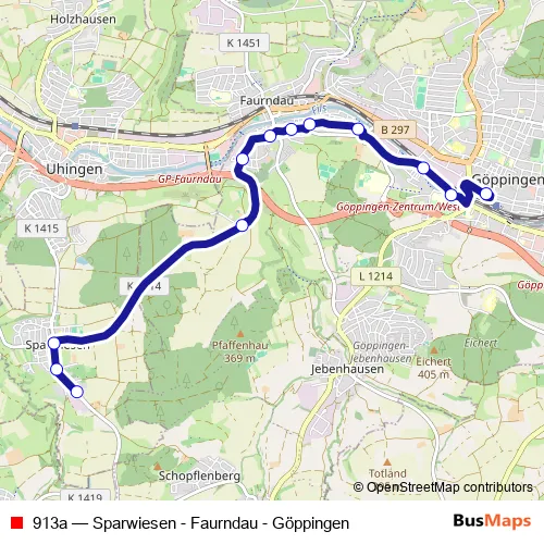 The first stop of the 913a bus route is Sparwiesen Gewerbegebiet and the last stop is Göppingen Zob. 913a (Sparwiesen - Faurndau - Göppingen) is operational during on weekdays.