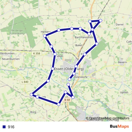 The first stop of the 916 bus route is Essen(Oldb) Schulzentrum and the last stop is Brook(Essen(Oldb)) Kuhlmann. 916 is operational during everyday.