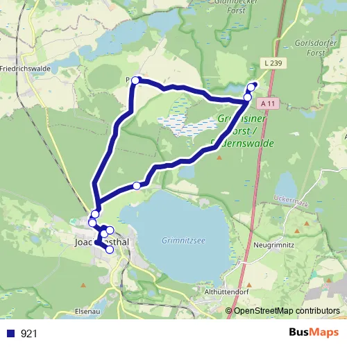 The first stop of the 921 bus route is Joachimsthal, Schule and the last stop is Joachimsthal, Schule. 921 is operational during on weekdays.