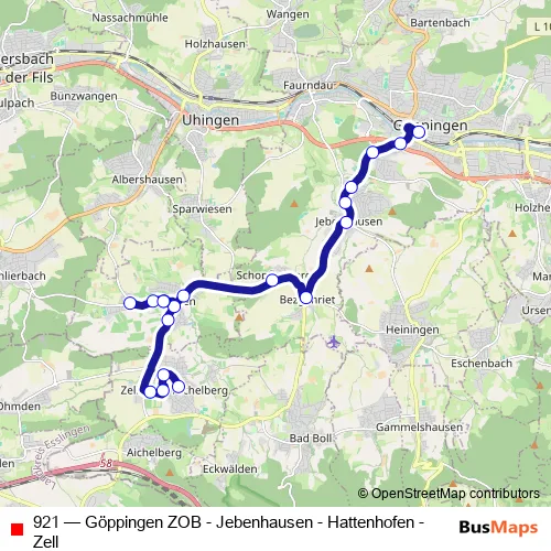 The first stop of the 921 bus route is Zell (A) Schillerstr. and the last stop is Göppingen Zob. 921 (Göppingen ZOB - Jebenhausen - Hattenhofen - Zell) is operational during everyday.