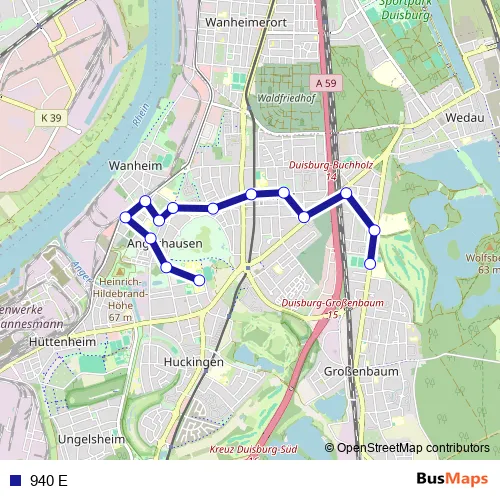 The first stop of the 940 E bus route is Duisburg Eibenweg and the last stop is Duisburg Schulzentrum Süd. 940 E is operational during on weekdays.