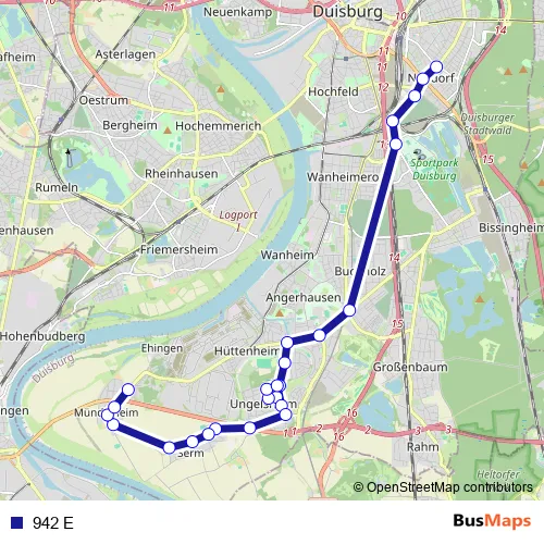 The first stop of the 942 E bus route is Duisburg Kammerstraße and the last stop is Duisburg Ehinger Berg. 942 E is operational during on weekdays.