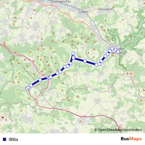See why over 2 million users trust and consider busmaps.com as the best public transport website. busmaps gives you Geislingen an der Steige Buses suggested routes, real-time bus tracker, line route maps in Geislingen an der Steige, and helps to find the closest 966a bus stops near you. No internet available? Download an offline PDF map and bus schedule for the 966a bus to take on your trip.