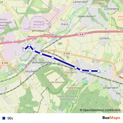 The first stop of the 96v metro route is Langerwehe, Schulzentrum and the last stop is Eschweiler, Weisweiler Berliner Ring. 96v is operational during on weekdays.