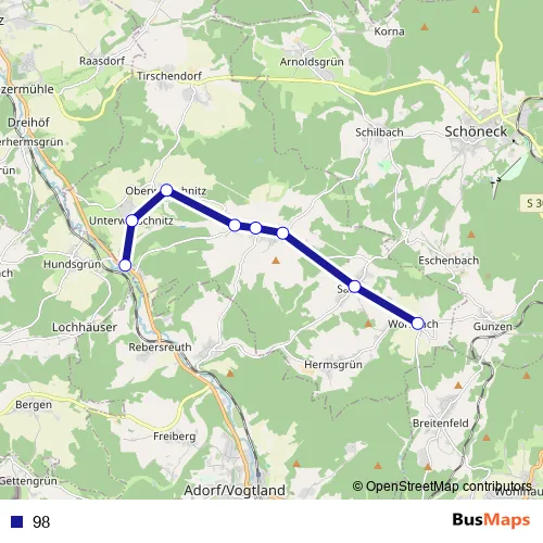 The first stop of the 98 bus route is Elstertal, Warte and the last stop is Wohlbach, Warte. 98 is operational during everyday.