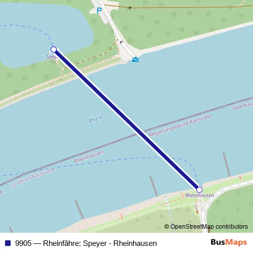 The first stop of the 9905 ferry route is Speyer, Alte Rheinhäuser Str. and the last stop is Speyer, Alte Rheinhäuser Str.. 9905 (Rheinfähre: Speyer - Rheinhausen) is operational during on weekends.