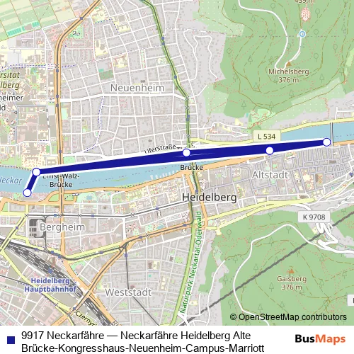 Click here to view the nearest 9917 Neckarfähre - Neckarfähre Heidelberg Alte Brücke-Kongresshaus-Neuenheim-Campus-Marriott ferry stop.