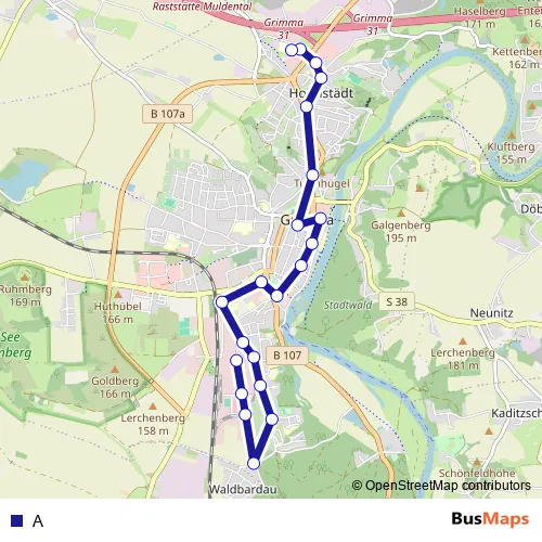 The first stop of the A bus route is Grimma, Bushof and the last stop is Grimma, Hohnstädt, Hengstberg. A is operational during everyday.