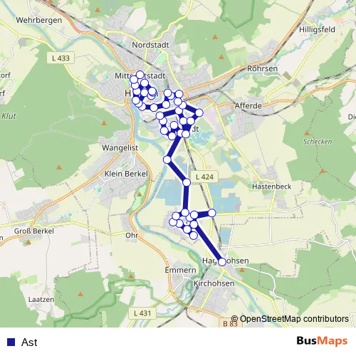 The first stop of the Ast bus route is Hagenohsen Amselweg and the last stop is Hameln Mertensplatz. Ast is operational during everyday.