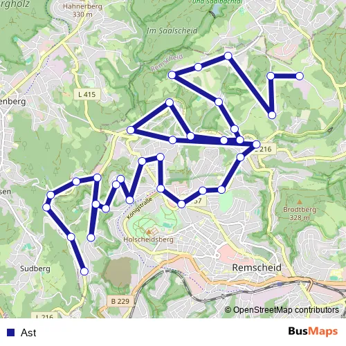 The first stop of the Ast bus route is Remscheid Flügel and the last stop is Remscheid Morsbach Schleife. Ast is operational during everyday.