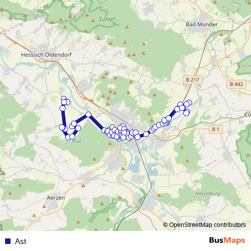 The first stop of the Ast bus route is Haverbeck(Hameln) Pappelallee and the last stop is Klein-Hilligsfeld Denkmal. Ast is operational during everyday.