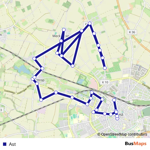 The first stop of the Ast bus route is Soest, AST-Zielgebiet and the last stop is Katrop, An der Güllenkuhle. Ast is operational during everyday.