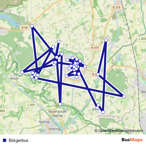 The first stop of the Bürgerbus bus route is Olfen, Am Westendorp and the last stop is Olfen, AST-Zielgebiet. Bürgerbus is operational during on weekdays.