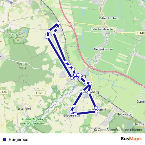 The first stop of the Bürgerbus bus route is Bf. Horneburg and the last stop is Bf. Horneburg. Bürgerbus is operational during on weekdays.