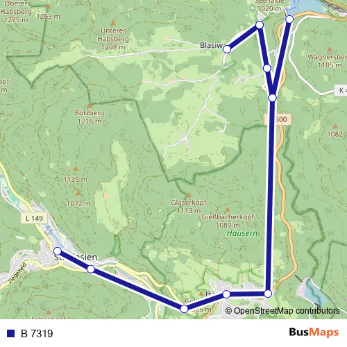 The first stop of the B 7319 bus route is Seebrugg, Staumauer and the last stop is St. Blasien, Busbahnhof. B 7319 is operational during everyday.