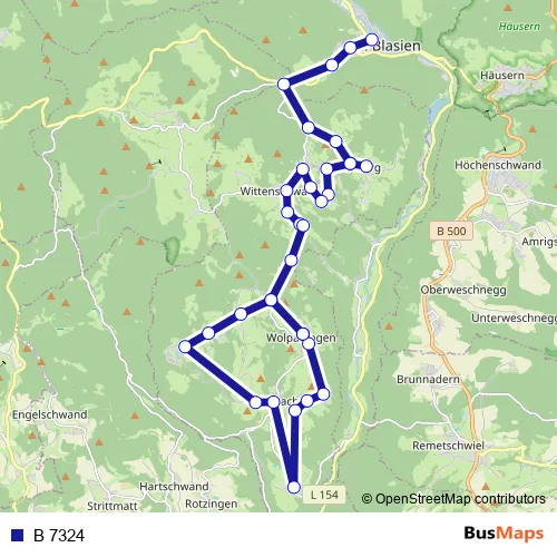 The first stop of the B 7324 bus route is St. Blasien, Busbahnhof and the last stop is Wolpadingen. B 7324 is operational during on weekdays.