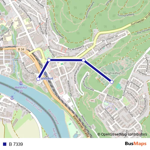 The first stop of the B 7339 bus route is Waldshut, Busbahnhof and the last stop is Waldshut, Bergfriedhof. B 7339 is operational during everyday.
