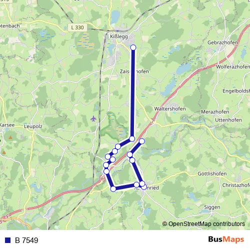 The first stop of the B 7549 bus route is Kisslegg, Schulzentrum and the last stop is Kisslegg, Rain. B 7549 is operational during everyday.