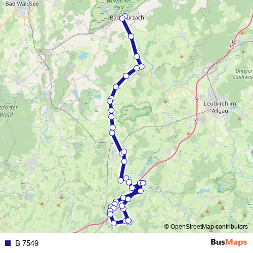 The first stop of the B 7549 bus route is Bad Wurzach, Post and the last stop is Waltershofen, Grundschule. B 7549 is operational during on weekdays.