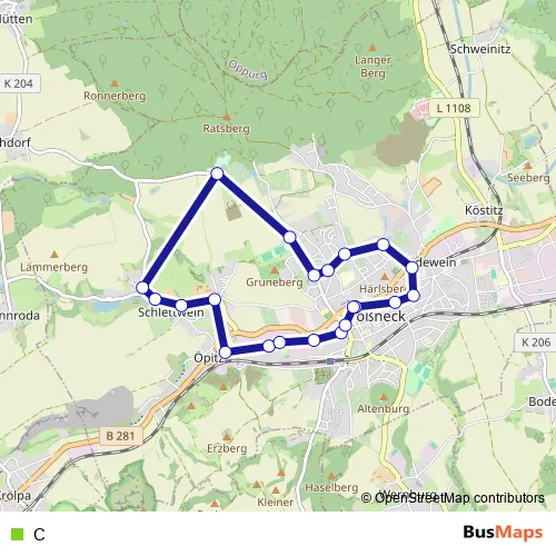 The first stop of the C bus route is Pößneck, Busbahnhof and the last stop is Pößneck, Busbahnhof. C is operational during everyday.
