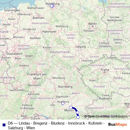 The first stop of the D6 rail route is Kufstein Bahnhof and the last stop is Hamburg-Altona. D6 (Lindau - Bregenz - Bludenz - Innsbruck - Kufstein - Salzburg - Wien) is operational during everyday.