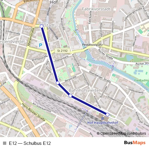 See why over 2 million users trust and consider busmaps.com as the best public transport website. busmaps gives you Hof Buses suggested routes, real-time bus tracker, line route maps in Hof, and helps to find the closest E12 bus stops near you. No internet available? Download an offline PDF map and bus schedule for the E12 bus to take on your trip.