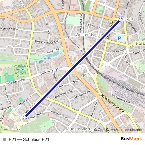 The first stop of the E21 bus route is Schulzentrum - Bussteig 2 and the last stop is Sonnenplatz (side Sparkasse). E21 (Schulbus E21) is operational during on weekdays.
