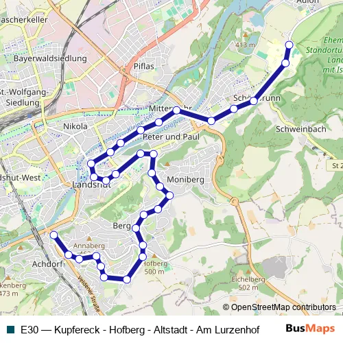 The first stop of the E30 bus route is Landshut, Kupfereck and the last stop is Landshut, Am Lurzenhof. E30 (Kupfereck - Hofberg - Altstadt - Am Lurzenhof) is operational during on weekdays.