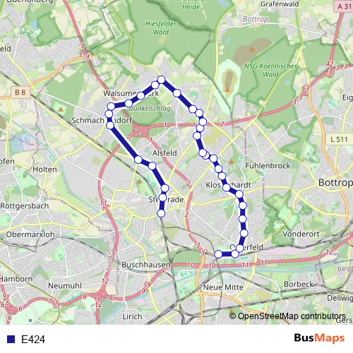The first stop of the E424 bus route is Oberhausen Olga-Park and the last stop is OB Sterkrade Bf.. E424 is operational during on weekdays.