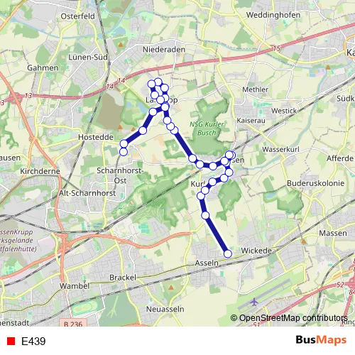 The first stop of the E439 bus route is Dortmund Asseln Schulzentrum and the last stop is Dortmund Droote. E439 is operational during on weekdays.
