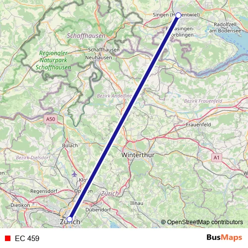 The first stop of the EC 459 rail route is Zürich Hb and the last stop is Singen (Hohentwiel). EC 459 is operational during everyday.