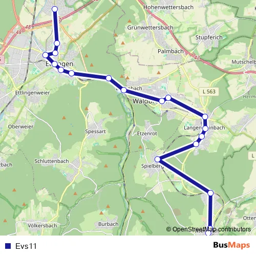 The first stop of the Evs11 bus route is Rüppurr Battstraße, Karlsruhe and the last stop is Ittersbach Rathaus, Karlsbad. Evs11 is operational during everyday.