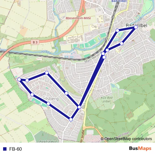 The first stop of the FB-60 bus route is Bad Vilbel Südbahnhof and the last stop is Bad Vilbel Südbahnhof. FB-60 is operational during everyday.