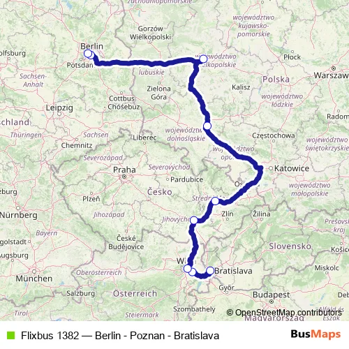 The first stop of the Flixbus 1382 bus route is Poznan, Bus Station and the last stop is Berlin central bus station. Flixbus 1382 (Berlin - Poznan - Bratislava) is operational during everyday.