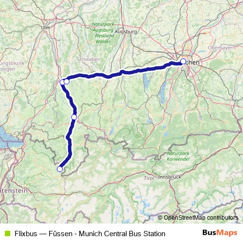 The first stop of the Flixbus bus route is Mittelberg Walserstrasse and the last stop is Munich Central Bus Station. Flixbus (Füssen - Munich Central Bus Station) is operational during everyday.