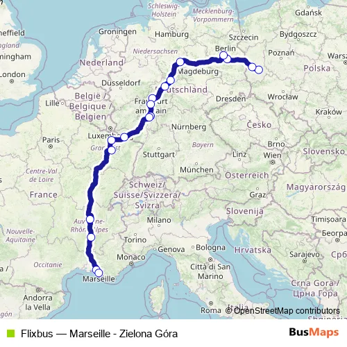 The first stop of the Flixbus bus route is Zielona Gora Dworcowa and the last stop is Marseille Saint Charles Bus Station. Flixbus (Marseille - Zielona Góra) is operational during everyday.