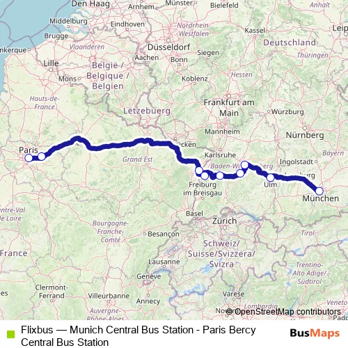 The first stop of the Flixbus bus route is Paris Gare de Bercy Seine and the last stop is Munich Central Bus Station. Flixbus (Munich Central Bus Station - Paris Bercy Central Bus Station) is operational during everyday.