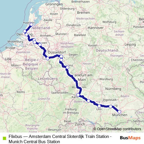 The first stop of the Flixbus bus route is Amsterdam Piarcoplein P+R Sloterdijk and the last stop is Munich Central Bus Station. Flixbus (Amsterdam Central Sloterdijk Train Station - Munich Central Bus Station) is operational during everyday.