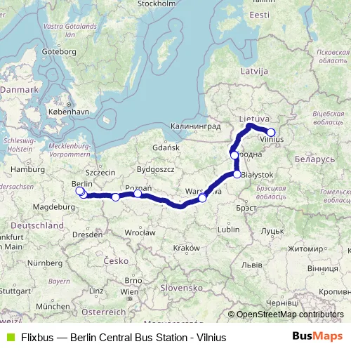 The first stop of the Flixbus bus route is Berlin Central Bus Station and the last stop is Vilnius Central Bus Station. Flixbus (Berlin Central Bus Station - Vilnius) is operational during everyday.