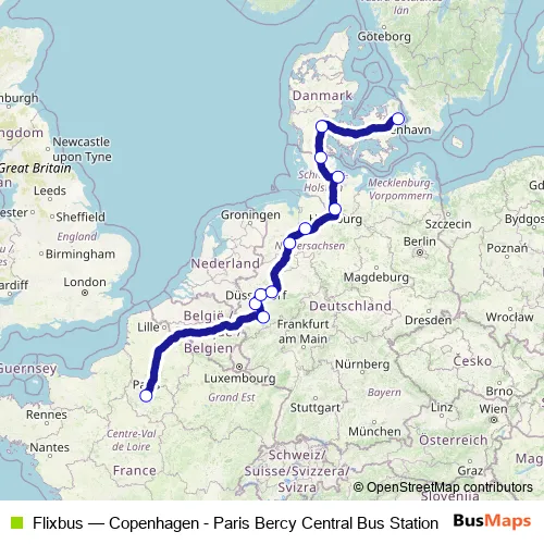 The first stop of the Flixbus bus route is Paris Gare de Bercy Seine and the last stop is Copenhagen Bus Terminal. Flixbus (Copenhagen - Paris Bercy Central Bus Station) is operational during everyday.