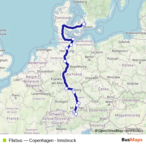 The first stop of the Flixbus bus route is Copenhagen Bus Terminal and the last stop is Innsbruck Südbahnstrasse. Flixbus (Copenhagen - Innsbruck) is operational during everyday.