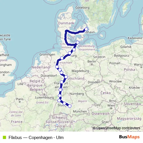 The first stop of the Flixbus bus route is Ulm Long Distance Bus Station and the last stop is Copenhagen Bus Terminal. Flixbus (Copenhagen - Ulm) is operational during everyday.