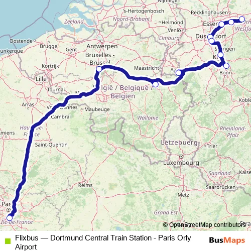 The first stop of the Flixbus bus route is Dortmund Bus Station Steinstrasse and the last stop is Paris Orly Sud airport Parking P4c. Flixbus (Dortmund Central Train Station - Paris Orly Airport) is operational during everyday.