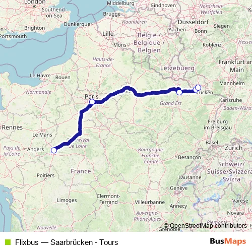 The first stop of the Flixbus bus route is Tours Vaucanson Bus Station and the last stop is Saarbrücken Bus Station. Flixbus (Saarbrücken - Tours) is operational during everyday.