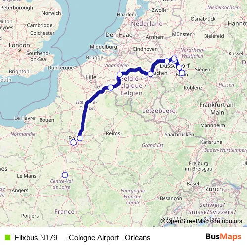 Bus Flixbus N179 - Cologne Airport - Orléans: Full Schedule in Duesseldorf