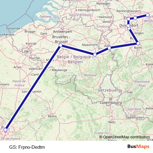 The first stop of the GS: Frpno-Dedtm rail route is Paris Gare du Nord and the last stop is Dortmund Hbf. GS: Frpno-Dedtm is operational during everyday.