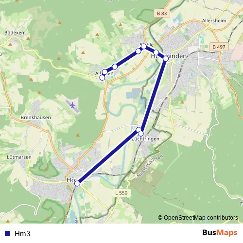 The first stop of the Hm3 bus route is Höxter, Bahnhof / Rathaus and the last stop is
